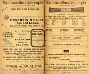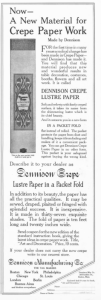 The sachets were a sign of things to come. In the 1890s crepe paper became widely available. As you can read in Seventy-Five Years, the four “Heath Sisters” of Buffalo realized what crepe paper could mean for “mak[ing] all manner of beautiful things.” In this case the customers made a pitch to the manufacturer. The manufacturer caught the fever, and passed it along to the public. The sisters’ demonstrations and display in Boston attracted such crowds that what become known as “Dennisoncraft” was soon being taught in branch stores, which came to include art departments. Advertisements show the growing prominence of the art department, even before its official establishment, and the development of new products and “dainty creations” that could be made with them.