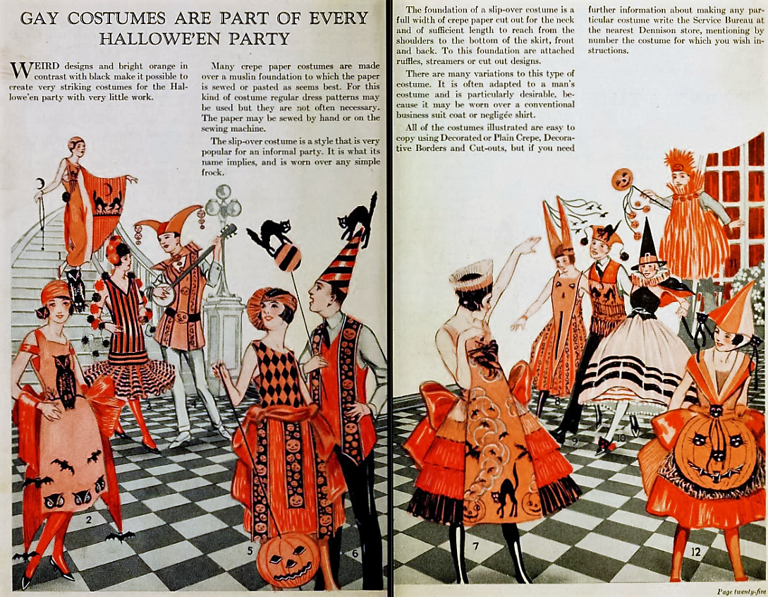 That is a far cry from the kaleidoscopic pageantry of the Dennison art department. But maybe even more could have been done. Was there ever a booklet for the Día de los Muertos? Or the Hinamatsuri, or Japanese Doll Festival/Girls’ Day? To get closer to home, consider this 1922 Christmas design. Hoops, wires, suitability for swirling and strutting. Was there really no Mummers connection?
