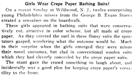 If you doubt that people actually wore the costumes, you can find photographs with live models and a surviving costume or two on Pinterest. In 1922 crepe paper went to the shore in the especially ephemeral form of bathing suits, modeled by women from the George B. Evans drug stores of Philadelphia. Before the amazed (or disappointed) spectators the paper suits gave way to woolen ones after they disintegrated in the waves.