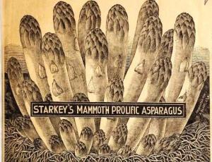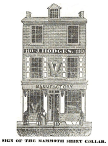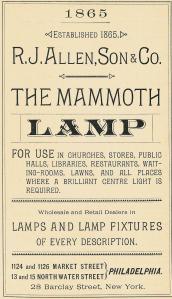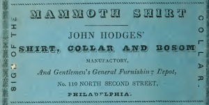 Circuses were often, and naturally, described as mammoth. Among the other advertisements, the only one that has the scale of the mammoth cheese is the mammoth soap displayed at the Centennial. The mammoth shirt collar is delightful, especially as it looks in the picture like a streamlined street lamp. And the owner clearly can’t resist playing with the idea of the mammoth shirt. There is a point in an oversized sign, but would be the point of mammoth products like lamps or (fake) mantels, and would anyone really want a mammoth fashion plate? And children might have nightmares about mammoth asparagus (maybe not about the less aggressive-looking Boston Mammoth White Plume Celery). Maybe the expression succumbed to incongruity.