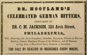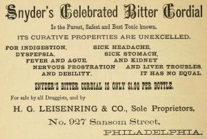 The advertisements for widely used bitters, bitter cordials, and bitter wine of iron, on the other hand, did not directly promote this cheerful view, because their sometimes hefty alcohol content was not acknowledged (the products were recommended for women and for children, who were said to cry for Snyder’s Celebrated Bitter Cordial). But it seems that most of these remedies contained alcohol, based on the manufacturing process and on independent tests, and that many people knew it.