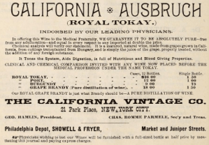 That ran against a long and respectable tradition of medicinal alcohol. The pre-Prohibition advertisements below do not speak of alcohol as, in the words of Carrie A. Nation, the “destroyer of men’s souls.” The first glass does not lead to the grave, as in the popular print “The Drunkard’s Progress,” but, when used in moderation, keeps users, young as well as old, out of the grave. Through sacramental use, alcohol benefits the soul as well. Medicinal and sacramental uses of alcohol are often paired in advertisements.