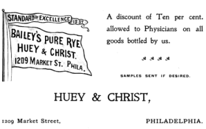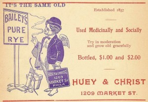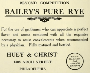 No matter what you think about drink and health, you might be startled by the rosy view of alcohol, especially hard liquor, in these advertisements. We may be reminded of old cigarette advertisements when we read of “leading doctors” who recommend one brand of whiskey for their patients. Advertisers sometimes allowed a hint of hedonism. For example, the 1903 mascot of Huey & Christ seems to be a combination of Puck, Cupid, and Peck’s Bad Boy, unlikely to “try in moderation and grow old gracefully.” But the firm’s advertising repeatedly linked Bailey’s Pure Rye with dignified aging, medical care (a nurse is shown ministering to a hospitalized man), and refined conviviality.