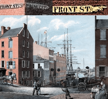 They are charming, but puzzling. Pointing signs usually direct attention away from their location, but the decipherable fingerpoint signs seem to be on the streets they name. “FRONT ST.” on the Front Street side of a building is a label, not a pointer. Then what does the pointing mean? The orientation is not toward the corner; some point away from the corner. Perhaps they regulated traffic? I found three Chestnut Street fingerpoints, all pointing east, but that could be coincidence. And why have traffic regulation on Plynlimmon Place, a dead end narrower than nearby Elfreth’s Alley? In fact, one-way streets seem to have appeared here only in the twentieth century.