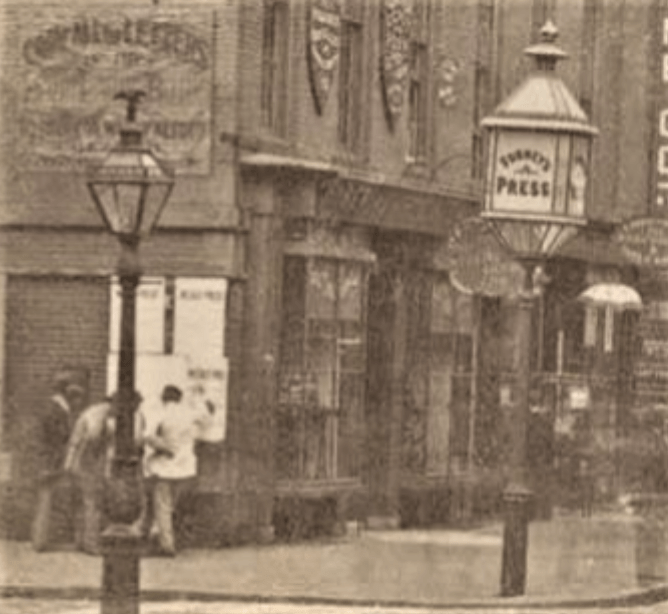 Advertising on lamps (perhaps not city-owned lamps) also turns up in old images (see Chestnut and Seventh above). Advertisements were not restricted to corners, or to lamp posts, but also appeared on lamps attached to buildings. Unlike the street names on Markland’s shatterproof name-plates, the advertising was usually applied to the glass itself, but there was at least one lamp that put a business name (THE TIMES, at Chestnut and Eighth) on a metal strip.