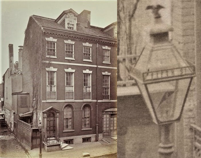 The second example of striking signage shows how sidewalk corners pick up public functions. As rowhouses acquired porches, bay windows, elaborate corbels, turrets, and abundant greenery, wall signs persisted, but might have been hard to see. For other buildings, like houses of worship, they seem to have been considered inappropriate. So, while also taking into account the increasing speed of travel, sidewalk signage became attractive. In 1868, Thomas T. Markland Jr. patented a “new and useful Improvement in Street-Lamps and other lamps,” which he proposed for use in Philadelphia. His improvement was “street-lamps with name-plates in the main body of the lamps, but [attached to the frame and] separate and distinct from the large glass plates,” so the names would not be lost if the plates broke. Markland’s patent speaks of perforated letters, but the Common Council speaks of “block letter[s]” with spaces in between, as shown in the right-hand image below, and in other old images. There would be signs on all four sides, so that the street names could be seen from all directions. (By the way, note the contrast below between Fifth and Fifth and Chestnut and Fourth.) They were also, unlike wall signs, at their best after dark.