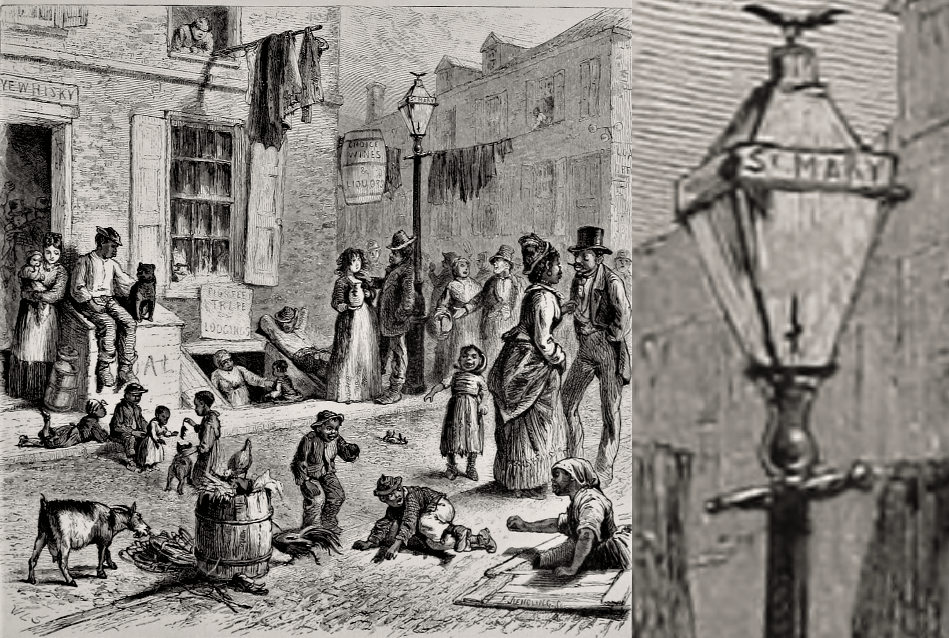 The streets of Gotham look like its own regiment of fantasticals; or rather like the farmer’s sons, of whom none looked alike but Benjamin. Each has its peculiarities to strike the eye, the ear, the nose or the shins. One has some half dozen magnificent churches, with steeples towering far above the city smells, into the regions of pure air. Another has no steeples at all, but is distinguished by shanties, pig styes, and slaughter houses. One is full of carts and drays, clattering like Milton’s devils in a pandemonian dispute. Another is full of omnibuses, roaring like Niagara, with the occasional scream of a woman or child, run over by the sober and orderly and well regulated drivers. The mud in one is knee deep; in another it reaches only to the ankle; while in a third, you sink over head, as in a Lybian quicksand. In one the eye is regaled by scores of dead cats; in another the nose is saluted with the odors of sundry dead dogs. In Broadway you are knocked down by an omnibus, in Pearl street by a cart, and in the Bowery by the Chicester gang. In short, no two are alike, each has its distinguishing characteristics, and you can not only tell where you are, but always perceive that you are where you ought not to be. But notwithstanding these striking, imposing, convincing differences, yet you find a guide board at every corner. So if you stumble over a dead dog in one street, and afterwards, in your course, stumble over a dead dog in another street, you have only to look up at the corner, to perceive that you are actually in another street, that you have not wandered back to your point of departure, and that the second dead dog is actually a different dead dog from the first dead dog.