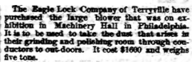 INQUIRER, 6 February 1877 Eagle Lock Company, Terryville, Philadelphia, Centennial, Machinery Hall blower