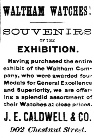 INQUIRER, 4 December 1876 Waltham Waches, J. E. Caldwell, 902 Chestnut, Philadelphia advertisement, Centennial
