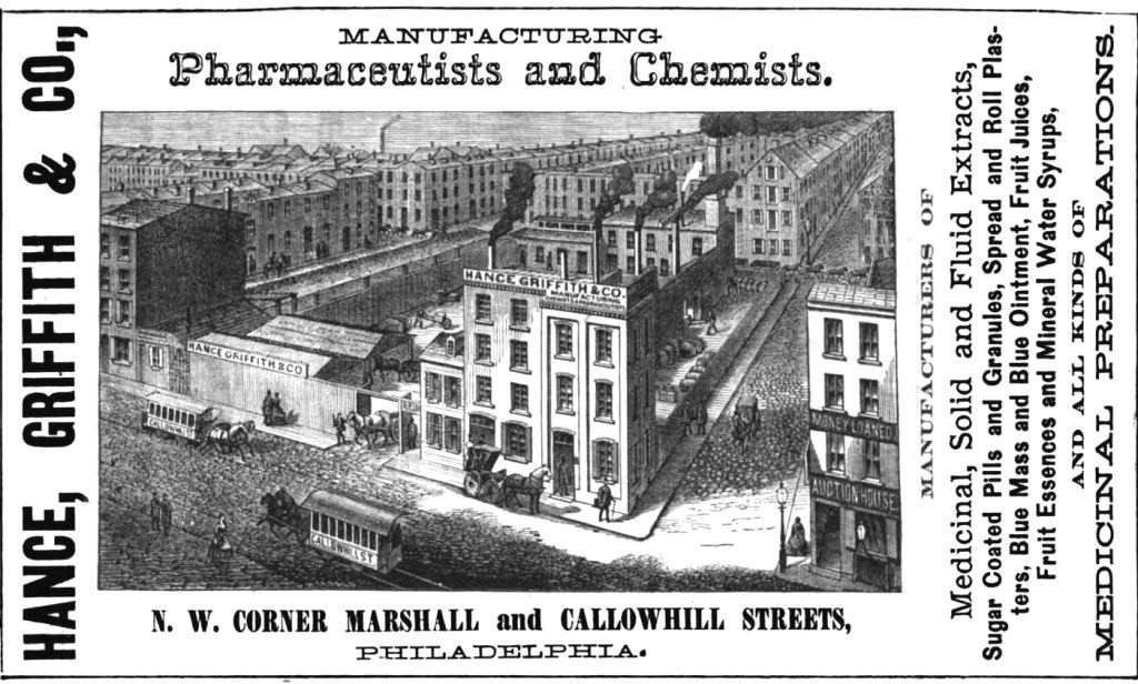Philadelphia advertisement for Hance, Griffith and Co,drugs and chemicals,Marshall and Callowhill, NW corner,1876 Freedley blue mass, extracts, sugar coated pills, syrups and essences