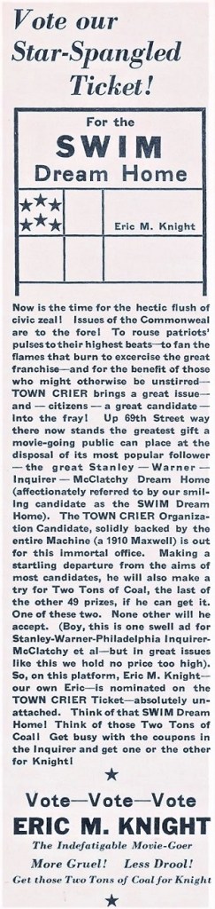 TOWN CRIER OF PHILADELPHIA, 19 May 1930, advertisement for Eric M. Knight, 69th Street, Upper Darby, McClatchy, movies, Stanley