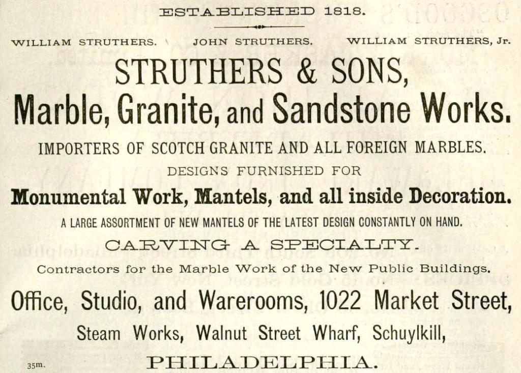 Philadelphia advertisement for Struthers and Sons, marble, granite, and sandstone works, 1022 Market Street and Walnut Street Schuylkill wharf, from Philadelphia and Its Environs, 1876, carving, Philadelphia City Hall, Scotch granite, mantels
