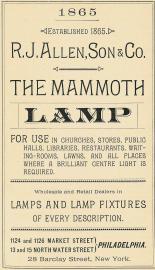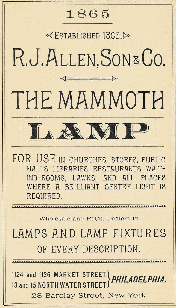 Philadelphia advertisement, R. J. Allen, Son & Co., 1124 Market, 1126 Market, 13 North Water, 15 North Water, lamps, mammoth, 28 Barclay New York, 1892