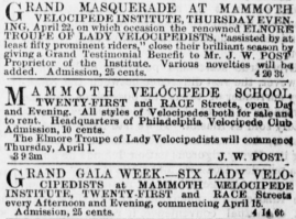 advertisement for the Mammoth Skating Rink and Velocipede Institute, Race and North 21st, April 20 1869, Philadelphia, lady velocipedists, performances, J. W. Post, Mammoth Velocipede Institute