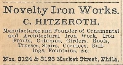 Philadelphia advertisement for C. Hitzeroth, Novelty Iron Works, 3124 3126 Market, 1890, architecture, iron fronts, columns, girders, roofs, cornices, fountains, stairs, roofs