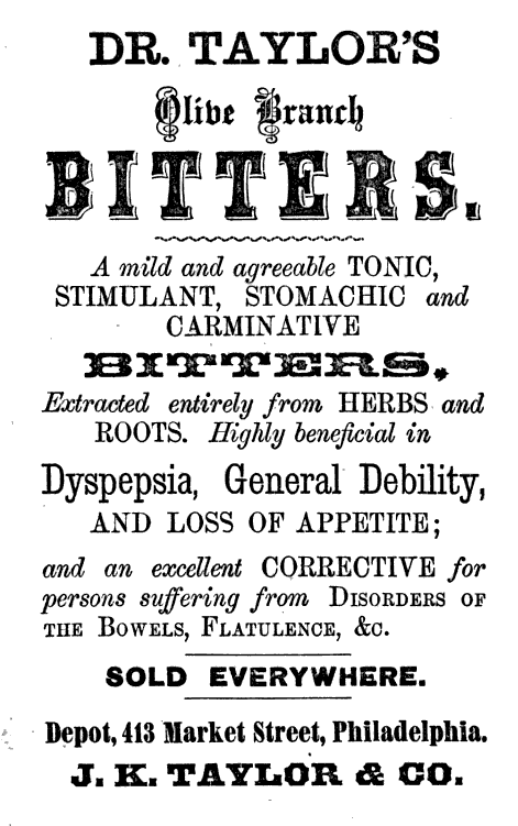 Philadelphia, advertisement, Dr. Taylor’s Olive Branch Bitters, 413 Market, 1869, patent medicine,J. K. Taylor and Co., Smith, Handbook and Guide in Philadelphia