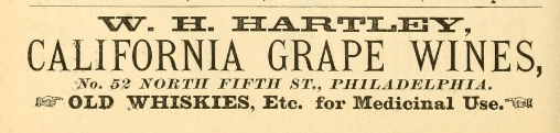 Philadelphia, advertisement, W. H. Hartley, California grape wines, medicinal whiskey, 52 North 5th, 1876, American Enterprise: Burley’s United States Centennial Gazetteer and Guide