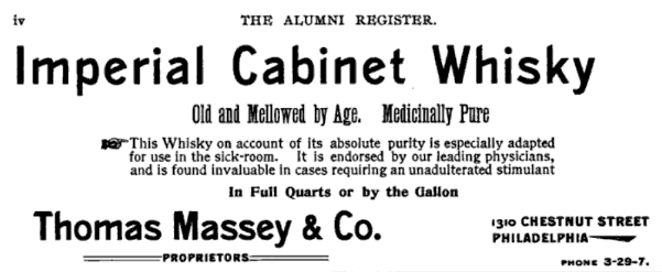 Philadelphia, advertisement, Thomas Massey and Co., 1310 Chestnut, 1900, Imperial Cabinet Whiskey, medicinal alcohol, stimulant, University of Pennsylvania Alumni Register