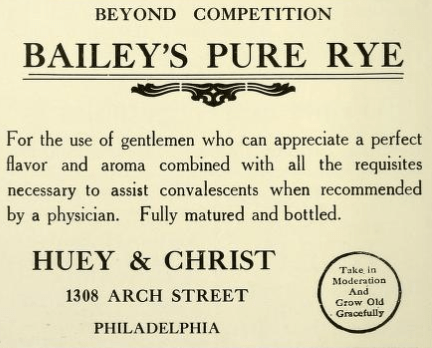 Philadelphia, advertisement, Huey and Christ, Bailey’s Pure Rye, medicinal alcohol, 1308 Arch, 1915, grow old gracefully, Annual Report of the National Farm School