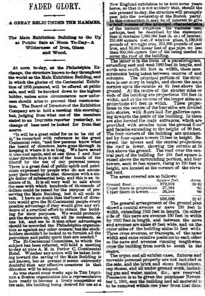 Centennial, Permanent International Exhibition, Main Exhibition Building, auction, Philadelphia Exchange, Bi-Centennial Committee, New England exhibition