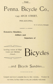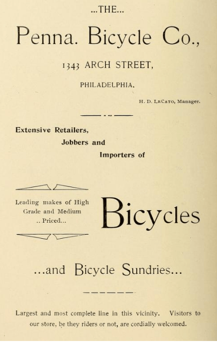 Club Men of Philadelphia, 1894 Philadelphia advertisement for Pennsylvania Bicycle Company, 1343 Arch Street, bicycle supplies Like Loading...
