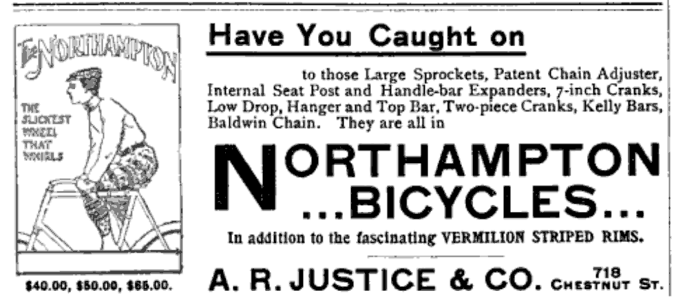 advertisement for Northampton Bicycles, A. R. Justice and Co., 718 Chestnut, Philadelphia, CITY AND STATE, 1898, bicycles, vermilion striped rims