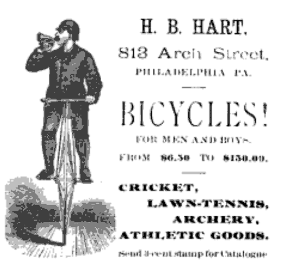 Philadelphia advertisement for H. B. Hart, 813 Arch, bicycles, athletic goods for men and boys, catalogue