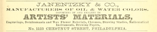 Philadelphia advertisement for Janentzky and Co., artists’ materials, 1125 Chestnut, 1876, decalcomania, wax flowers, chromos, paper, mathematical instruments
