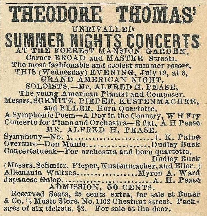 Philadelphia advertisement for Theodore Thomas’ Summer Nights Concerts at the Forrest Mansion Garden at North Broad and Master, The Press, 19 July 1876, summer resort,