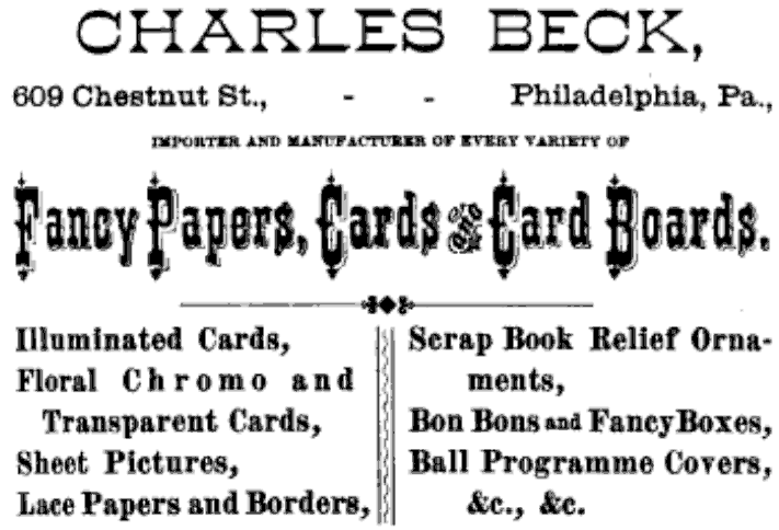 Philadelphia advertisement for Charles Beck, fancy paper, cards, cardboard, 609 Chestnut, 1879, American Stationer, chromos, lace paper scrapfooks, programmes