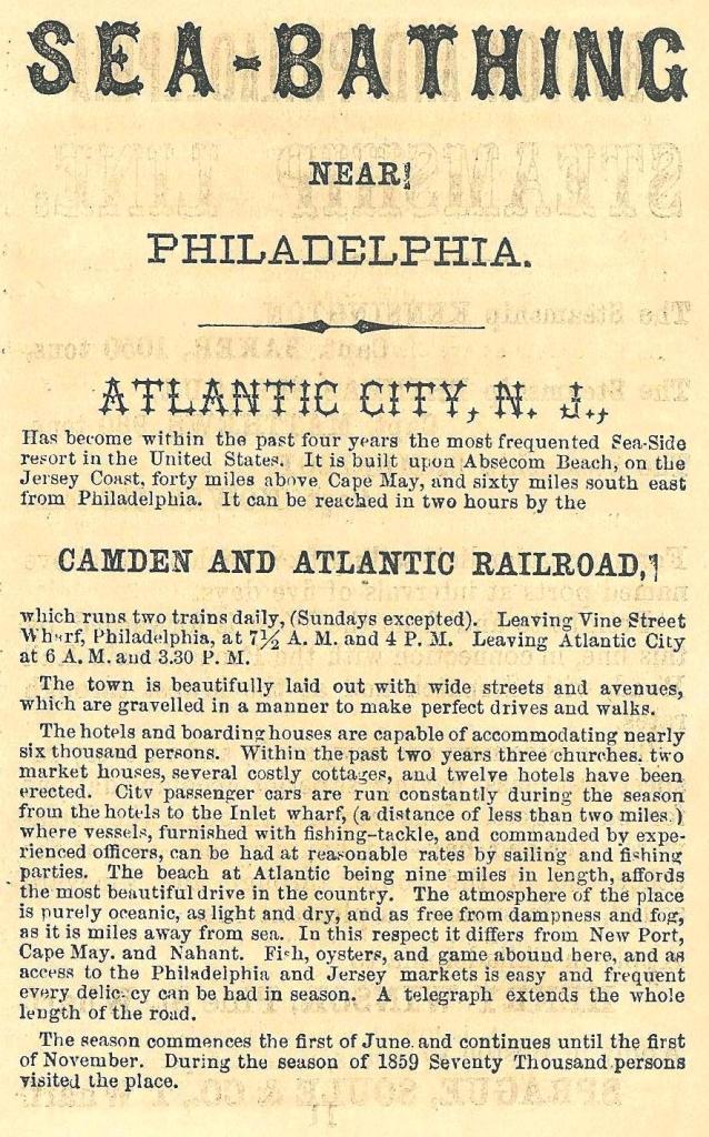 Philadelphia advertisement for the Camden and Atlantic Railroad between Atlantic City, New Jersey, and Philadelphia, Cowell’s Business Directory, 1860, sea-bathing