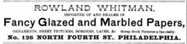 Philadelphia advertisement for Rowland Whitman, fancy and marbled papers, laces, ornaments, scrap books, 126 North 4th, 1879