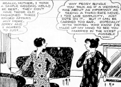 The comics featured on the fan are right at home in the world of Kitty Foyle. Bringing Up Father presented a “shanty Irish” immigrant, suddenly wealthy, who tried to escape from the refinements and the rolling pin of his “lace-curtain” wife, in order to carouse with his old friends, not at Dooner’s, but at Dinty Moore’s. Winnie Winkle was the first working girl to star in a strip, while Jane Arden led a more glamorous life as a reporter. Incidentally, both characters inspired well-dressed paper dolls. As a schoolgirl, Kitty had played with paper outfits and paper dolls with names from the society columns. The dolls lived in a Dream House furnished with ads cut out of Curtis Publishing Company magazines.