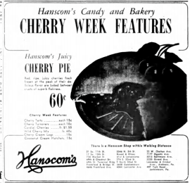 Philadelphia advertisement for Hanscom’s Bakeries, cherry pie, INQUIRER, 1949, cocoanut cream hatchets, Washington’s Birthday