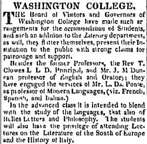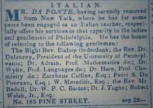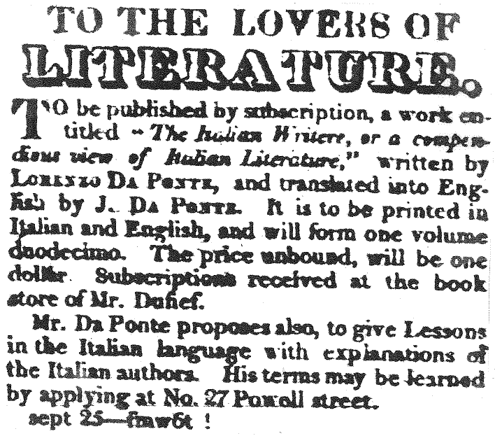 Please note that here Da Ponte is a teacher of Italian, not French, and that Joseph is acting as his assistant. After Da Ponte returned to New York, The Port Folio published a similar notice with his new address (July 1819).