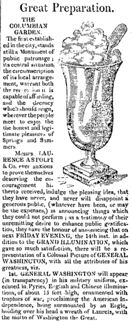 Da Ponte says little about the millinery shop, which was set up to make use of goods that had fallen into his hands (384). He has much more to say about his dealings with confectioner and fellow distiller Lawrence Astolfi, a native of Corsica whom Da Ponte, always grateful for a chance to speak Italian, befriended around the time of the move to Sunbury. Astolfi’s hospitality, piety, and good reputation were reassuring, but, says the poet in an echo of Così Fan Tutte, lauda finem (370). Da Ponte allowed him to sell some goods brought from New York. We can anticipate what he did not: a victim of Astolfi’s “confectioned hypocrisy,” Da Ponte was left beating his head with his fists. He found a characteristic consolation in a rumor that Astolfi, like many of his tormentors, had come to a bad end (379). Perhaps he was consoled, or would have been consoled, by the knowledge that Astolfi —depicted as an organ grinder—had been subjected to libel by waxwork (Richard N. Juliani, Building Little Italy: Philadelphia’s Italians before Mass Migration, 77). Meanwhile, Astolfi became the proprietor of the Columbian Garden, an elegant resort on the north side of Market Street between Thirteenth and Center Square, where he offered entertainment and strawberry ice cream. (Astolfi’s selection included “pine apple” and several others, but strawberry appears to have been his specialty.)
