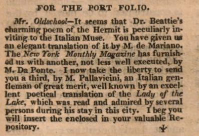 In the pages of The Port Folio, of which Ingersoll was a patron, Da Ponte himself appears as a literary figure, though, as Livingston says, the journal accepted him with “a certain wariness” (414n). Is the man in the notices below the same one who was at the center of the Pennsylvania Gothic tales in the Memoirs? That man looks isolated and helpless when he wastes his classical abuse on a Cacus or on Thaïses who would not understand the allusions. Livingston’s notes remind us to look beyond the Memoirs, which are setting us up for the deliverance to New York. The Port Folio reminds us that in 1817 and 1818 Da Ponte’s literary connections, for example, those with Thomas Mathias (“T. M.”), counted for something.