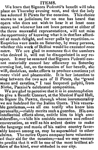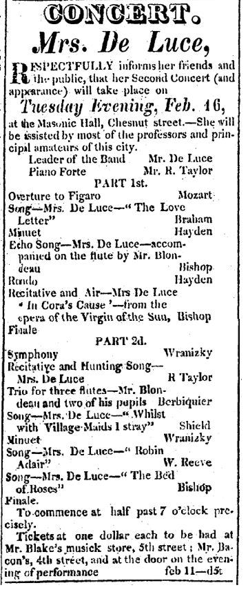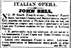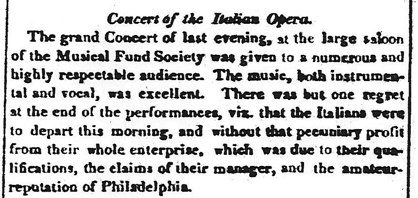 The tour was not a triumph for Da Ponte. After being eased out of his position, denied his benefit performance (he did receive benefits in New York, in July 1833 and June 1834), abandoned by most of the company (but not by Bagioli) while recovering from a painful injury, and losing a great deal of money, he wrote a bitter account of the tour, Storia incredibile ma vera, which described Philadelphia as “quella malaugurata città. Malaugurata per me, perché non ebbi la sorte mai di visitarla senza dissapori o disgrazie fatali.”