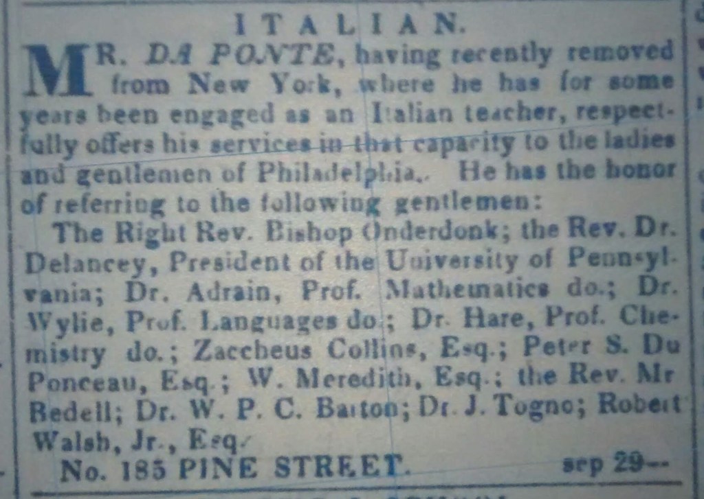 “Lorenzo L Da Ponte” Philadelphia “study of Italian” education “William H. Delancey” “Zaccheus Collins” “Peter S. Du Ponceau” “W.P.C. Barton” education “185 Pine St”