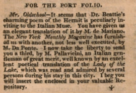 “The Port Folio” Philadelphia journal literary magazine literature 1818 Beattie “The Hermit” translations “Lorenzo Da Ponte” Mariano Pallavicini