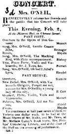 Philadelphia advertisement concert opera “Masonic Hall” 1819 “Mrs. O’Neil” “Don Giovanni” overture “Oh, Had I Jubal’s Lyre” recital “Mrs. O’Neill” Taws “Mathew Carey”