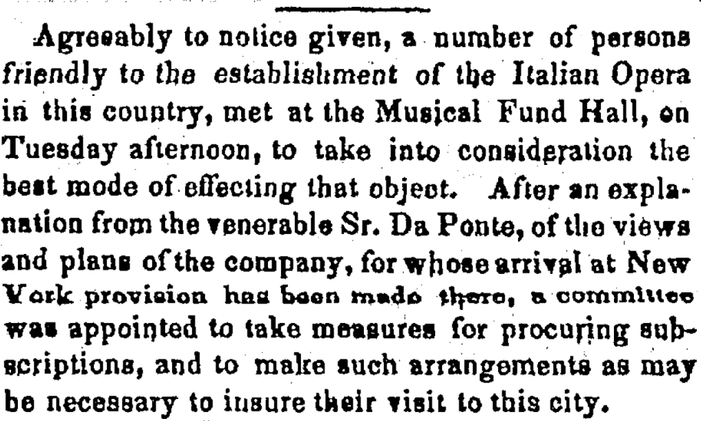 Philadelphia advertisement 1831 “Lorenzo Da Ponte” “Musical Fund Hall” “Italian opera” Montresor Montressor opera “New York” subscriptions