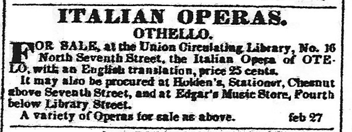 Philadelphia advertisement Othello Otello “Italian opera” Montressor Montresor “Union Circulating Library’ library opera Holden’s Edgar’s “16 North Seventh” 1833 translations