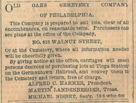 advertisement for Old Oaks Cemetery Company, 518 Walnut Street, Philadelphia, Daily Evening Telegraph, 1871, Alfred C. Harmer, Martin Landenberger, MIchael Nisbet
