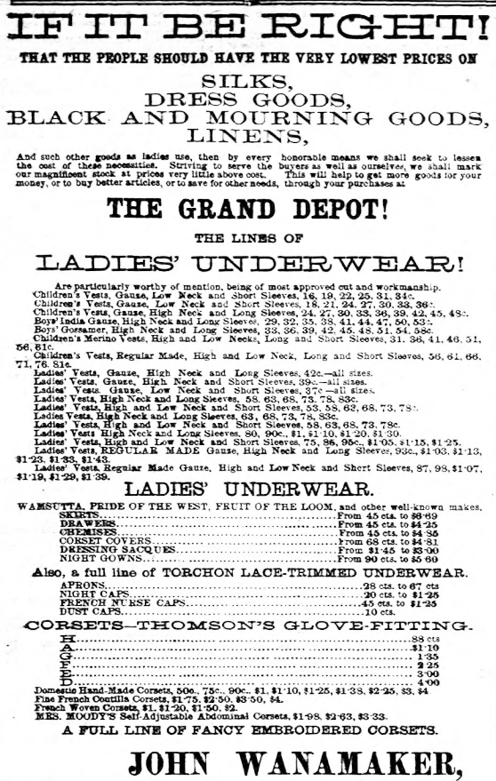 advertisement for John Wanamaker Grand Depot,Market and 13th Streets, Philadelphia, lingerie, mourning, torchon lace, corsets, Inquirer 1877