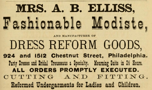 Philadelphia advertisement for Mrs. A. B. Ellis, modiste, mourning clothes, reformed undergarments, 924 1512 Chestnut, 1876, trousseaus