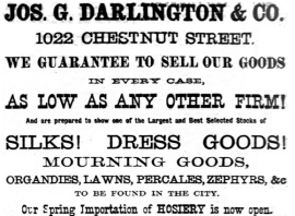 Philadelphia advertisement for Joseph G. Darlington and Co, 1022 Chestnut, dry goods, silks, mourning goods, hosiery, 1877