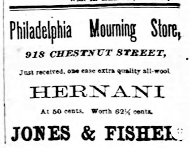 Inquirer, 8 May 1877 Philadelphia advertisement for Jones and Fisher mourning store, 918 Chestnut, 1877, hernani Like Loading...