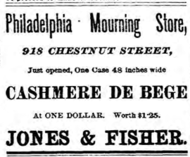 Philadelphia advertisement for Jones and Fisher Philadelphia Mourning Store, 918 Chestnut, cashmere de bege