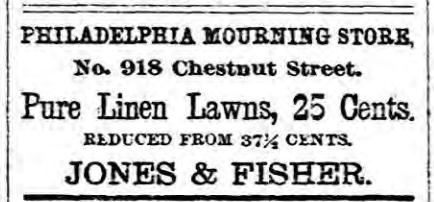 Philadelphia advertisement for Jones and Fisher Philadelphia Mourning Store, 918 Chestnut, 1877, linen lawns